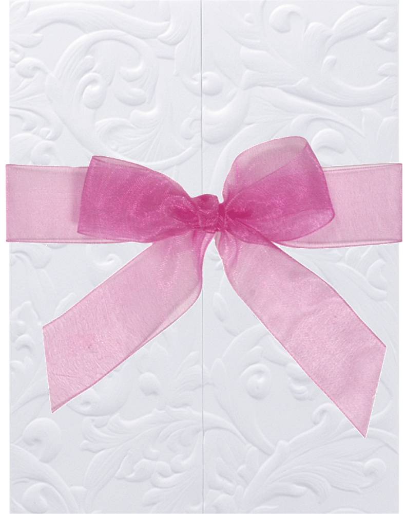 Et fint hvidt kort med tilhørende bånd, som bindes rundt om kortet. Kortet åbnes på midten, hvor tekst kan trykkes.