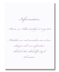 Informationskort i hvidt papir. Ofte skal bryllupsgæsterne have en del ekstra information i forbindelse med festen. Tryk informationskort til jeres gæster, hvor al praktisk info står på; vejbeskrivelse, hotelreservation, ønskeliste og meget mere, som gæsten kan tage med sig. 150 grams papir. Mål 146x109 mm. : florence , snefnug Korttype til filter: Informationskort Kategori: informationskort , kort Team til filter: inf Katagori: Info - Levering og fragt